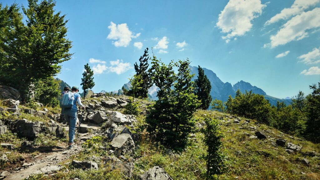 One of the most dramatic sections of the Peaks of the Balkans Trail, this long and rewarding hike crosses from Montenegro into Albania through the wild heart of the Accursed Mountains. Surrounded by towering limestone peaks and untouched alpine scenery, it offers an unforgettable high-mountain experience. The journey begins in the village of Vusanje, heading west into the impressive Ropojane Valley. The trail follows a forestry track for approximately 4.5 km through the broad valley floor before reaching a junction where the route branches left toward Buni i Jezerces.